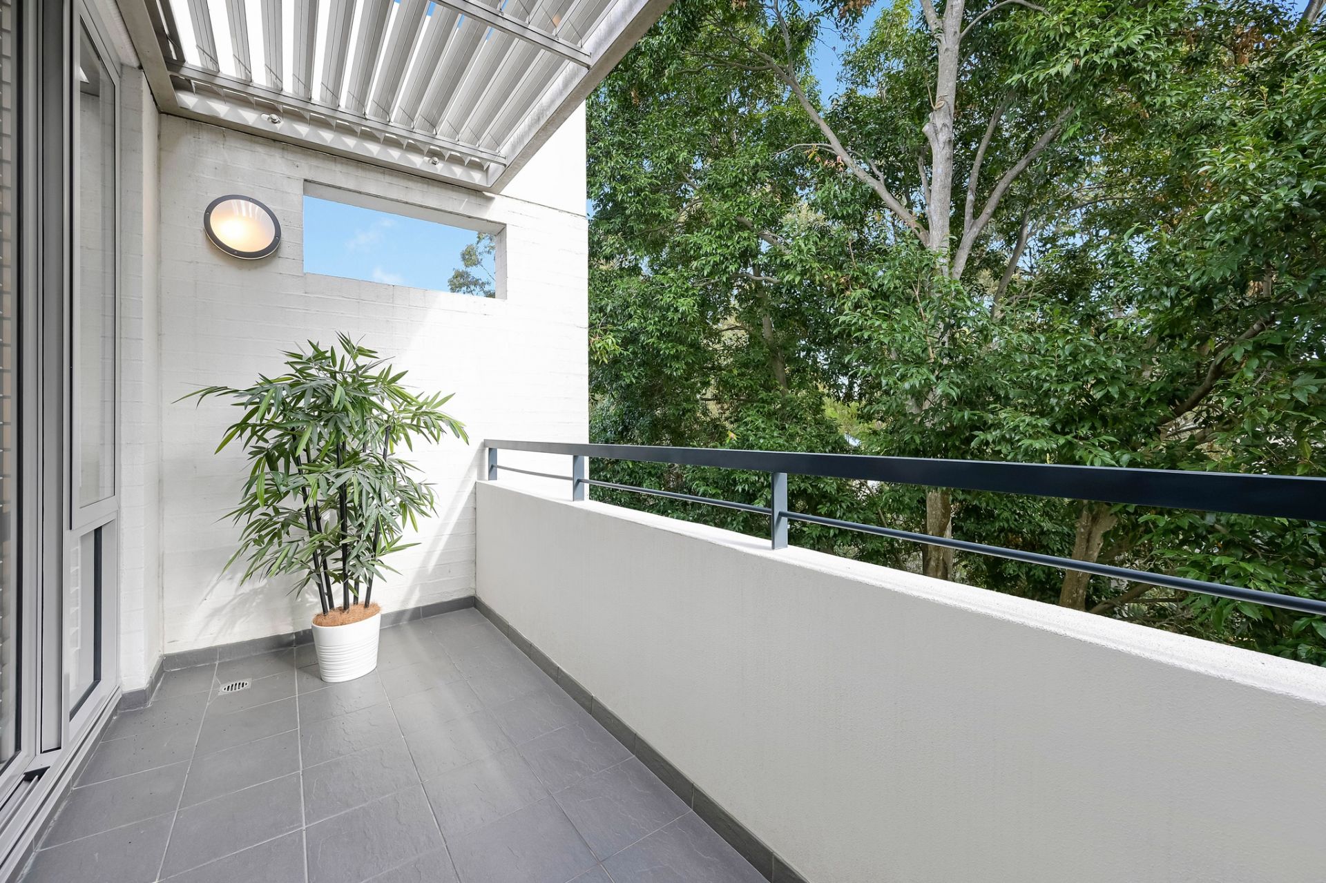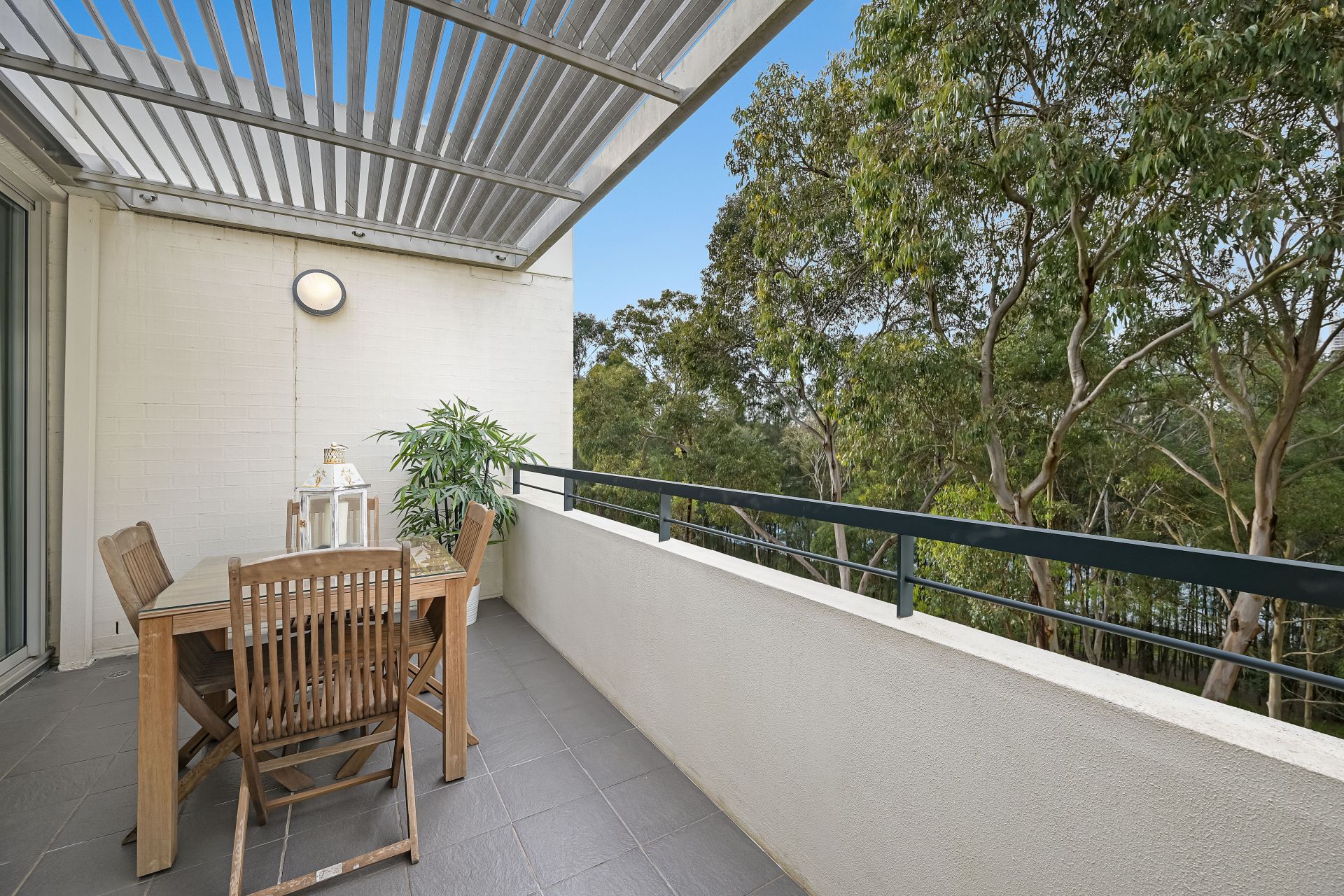 - Dual balconies with private treetop views and water glimpses