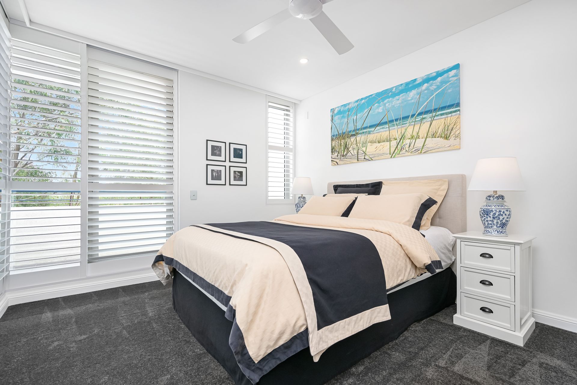 - Plantation shutters, walls of glass and a cross-flow breeze