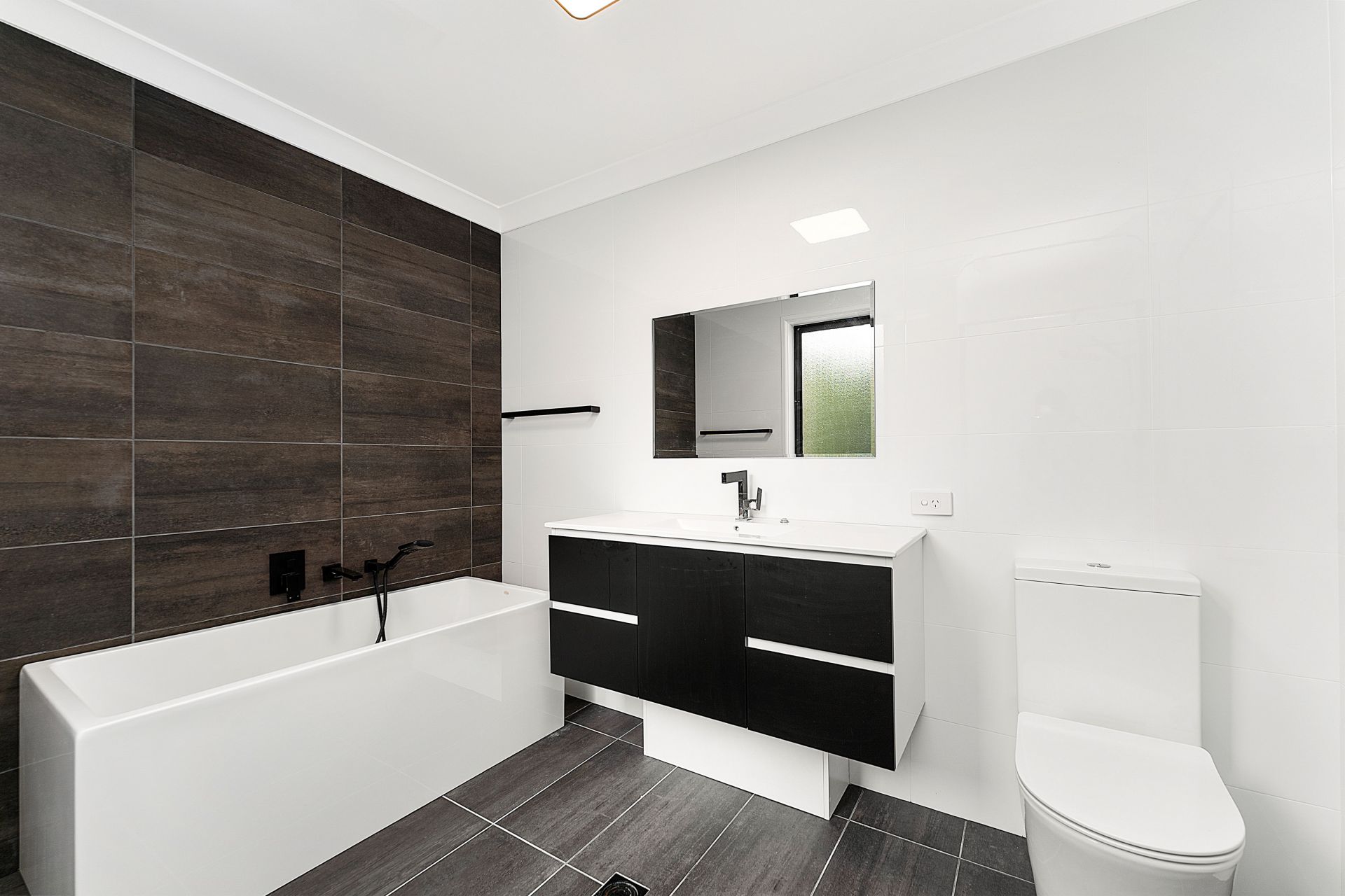 Upstairs, you'll find three generous, carpeted bedrooms, all with built-in mirrored wardrobes. The master suite offers air conditioning, a private balcony, and a stunning renovated ensuite with a full-size bathtub and contemporary finishes. A stylishly updated main bathroom with a vanity and shower recess serves the additional bedrooms.