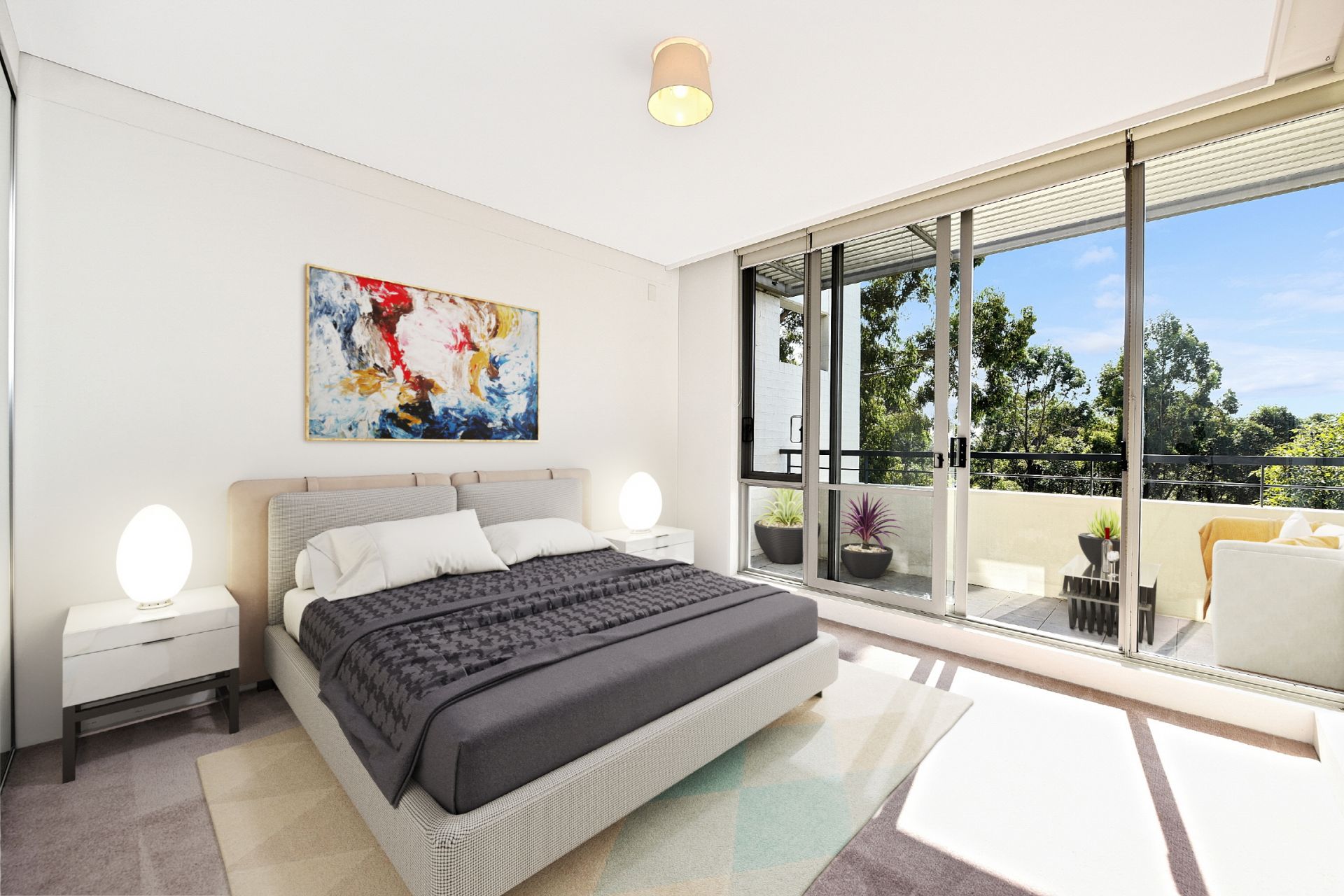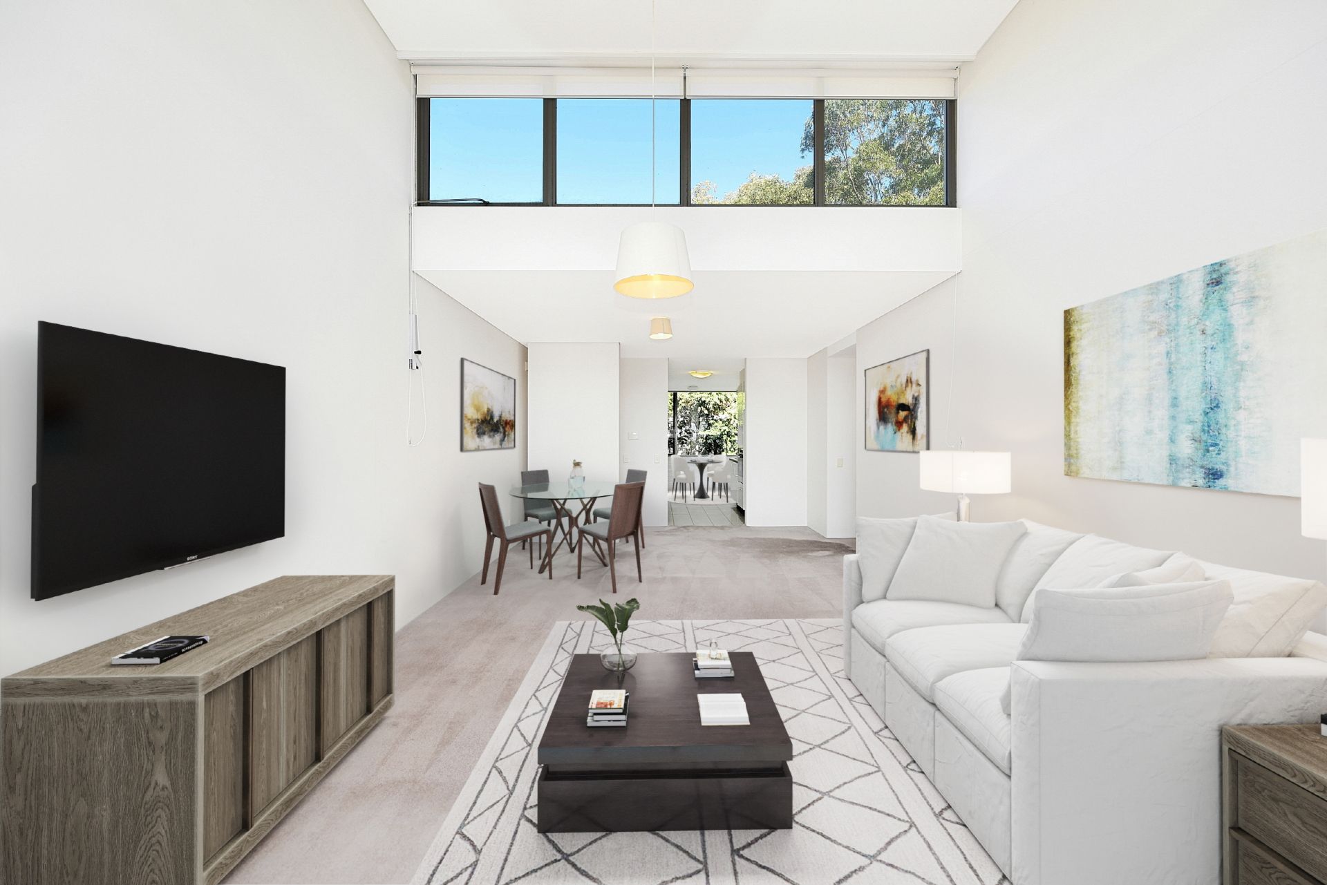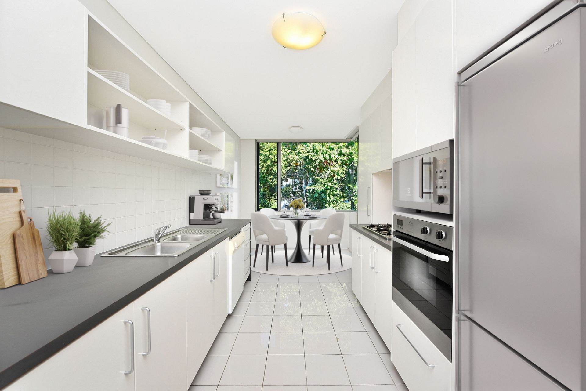 The expansive open-plan living and dining area is flooded with natural light and features impressive 4-metre cathedral ceilings with additional highlight windows. This space flows seamlessly onto a sunny north-east facing balcony, offering expansive views over Newington Armoury and surrounding parklands.